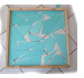 Matériel nécessaire : un ensemble de formes variées et nombreuses dans un matériau résistant : triangles, quadrilatère, et quelques polygones ayant plus de quatre côtés, découpés dans un même matériau (revêtement de sol, carton, panneau de particules…). Un cadre rigide ou à défaut une feuille de couleur du format du cadre.