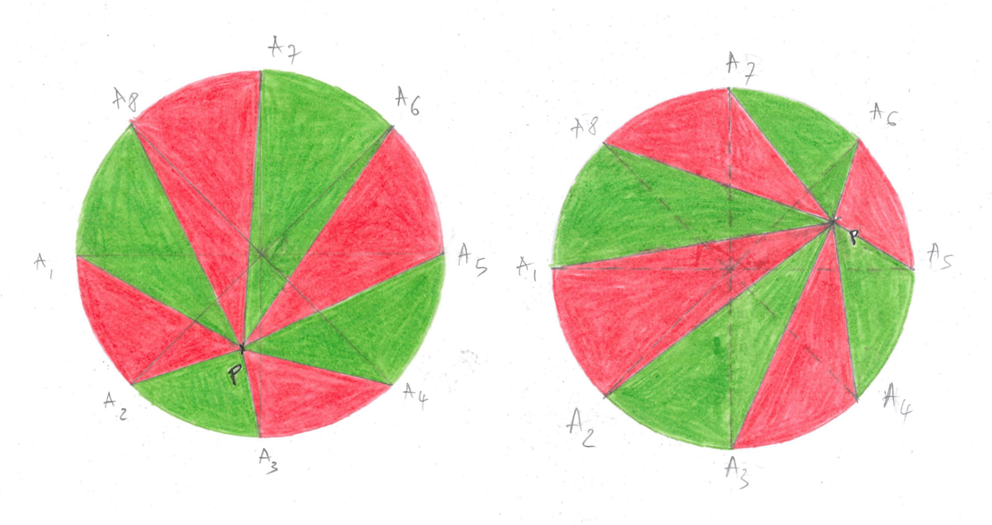 - Coloriage : Utilisez un crayon vert pour colorier la région délimitée par A1, P et A8. Utilisez un crayon rouge pour colorier la région délimitée par A8, P et A7. Continuez à alterner ces deux couleurs pour les régions restantes (Ai P Ai-1) jusqu’à ce que tout l’intérieur du cercle soit colorié.